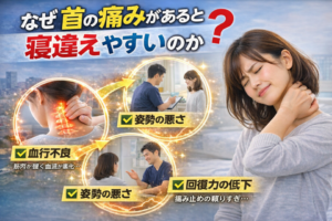 首の痛みがある状態は、筋肉が緊張し血流が悪化しているサインです。その状態で睡眠中に無理な姿勢が加わると炎症が起こりやすく、寝違えにつながります。