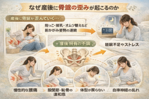 これは、産後に骨盤が開いたまま、または歪んだまま固まってしまうことが原因の一つです。