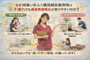 城東区で子育てをされているママさんの多くが、「子連れでは産後骨盤矯正は難しいのでは」と不安を感じています。しかし、城東いまふく鶴見鍼灸整骨院では子連れでの来院を前提とした環境づくりを行っています。