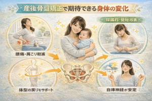 産後に骨盤の歪みを整えることで、身体にはさまざまな良い変化が期待できます。