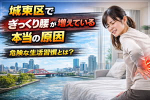 A. 城東区でぎっくり腰になる原因は、単なる重い物を持ったことではなく、姿勢不良・筋力低下・骨盤の歪み・生活習慣の蓄積が背景にあります。